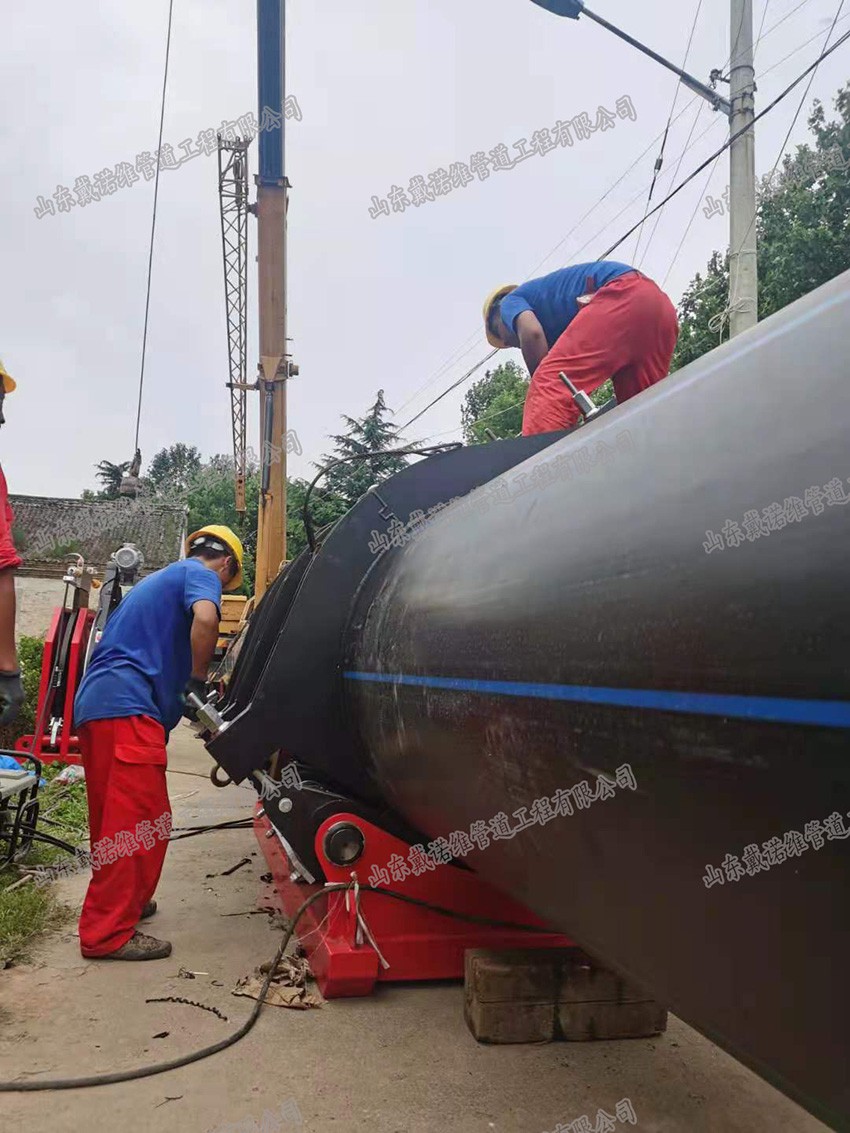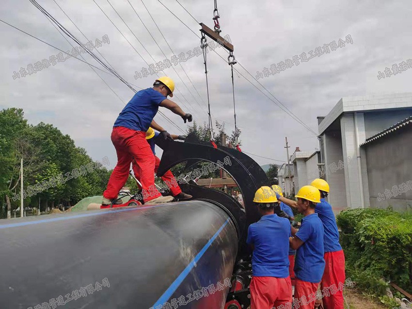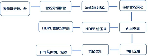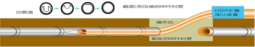 管道內(nèi)襯PE管修復(fù)是將外徑等于或略小于待修復(fù)管道內(nèi)徑的HDPE襯管,通過(guò)專用壓U設(shè)備,截面被壓變成雙層U形。在牽引力的作用下穿入待修復(fù)管道內(nèi)部。穿插到位后,利用壓力打開(kāi)管腔,使之恢復(fù)成圓形,與外管道內(nèi)壁貼合,形成牢靠的復(fù)合管。